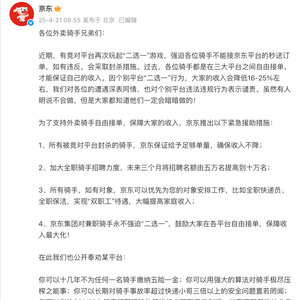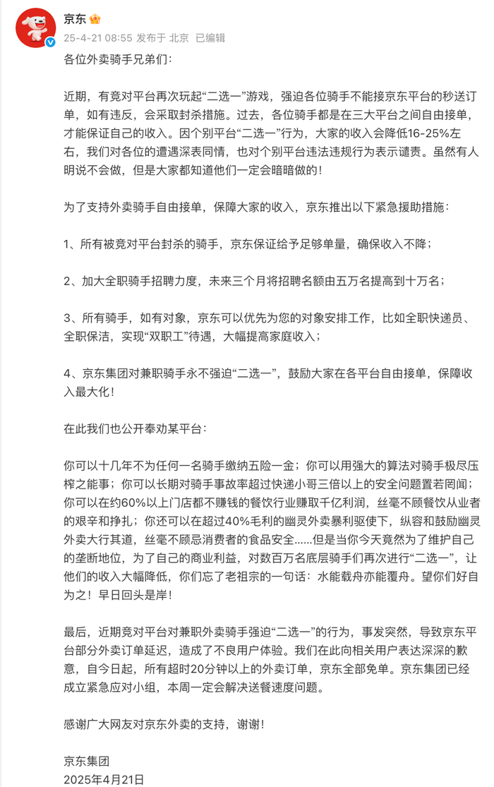 如上图所见,京东官方表示近期“有竞对平台再次玩起‘二选一’游戏”,导致部分骑手收入降低16-25%左右。京东称对受影响骑手的遭遇深表同情,也对个别平台违法违规行为表示谴责。并表示由于近期竞对平台对兼职外卖骑手强迫“二选一”的行为,事发突然,导致京东平台部分外卖订单延迟,造成了不良用户体验,在此向相关用户表达深深的歉意,自今日起,所有超时20分钟以上的外卖订单,京东全部免单。京东集团已经成立紧急应对小组,本周一定会解决送餐速度问题。