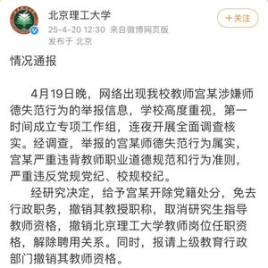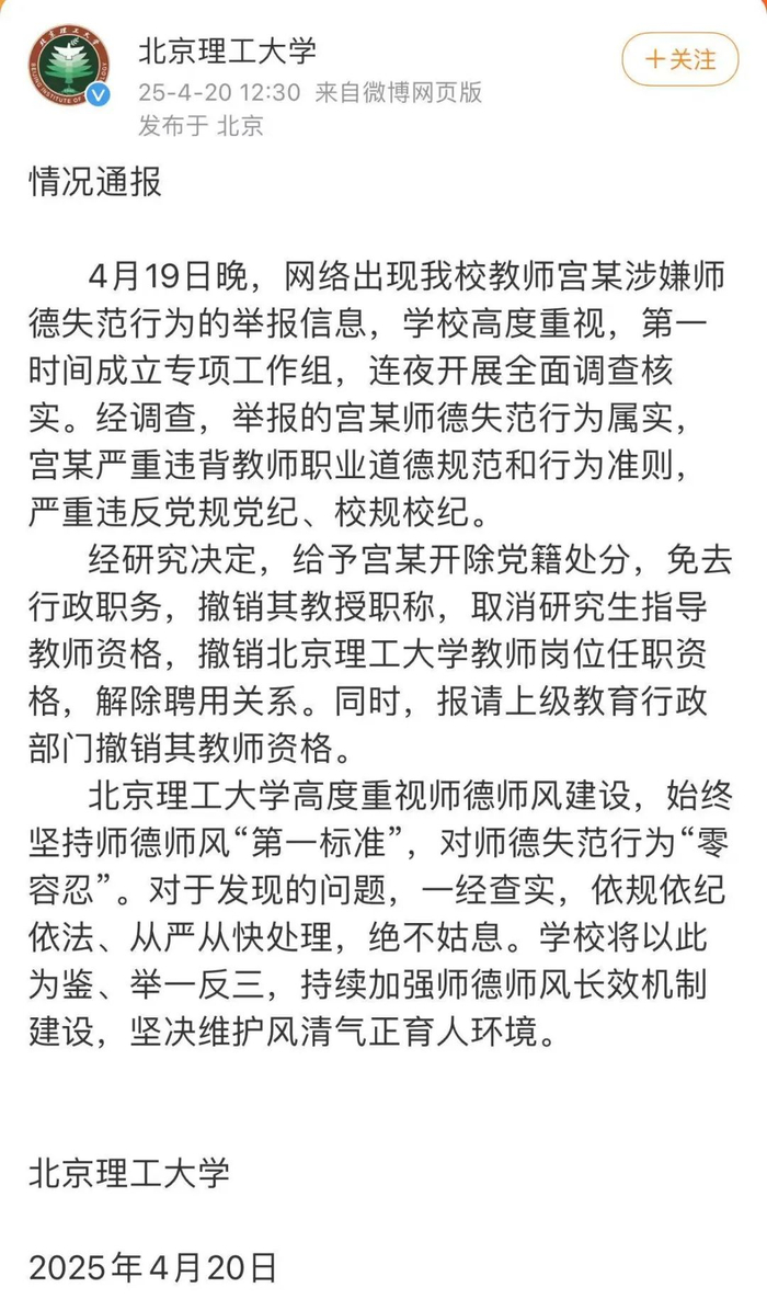 对此,4月20日中午,北京理工大学发布情况通报:经调查,举报的宫某师德失范行为属实,宫某严重违背教师职业道德规范和行为准则,严重违反党规党纪、校规校纪。经研究决定,给予宫某开除党籍处分,免去行政职务,撤销其教授职称,取消研究生指导教师资格,撤销北京理工大学教师岗位任职资格,解除聘用关系。同时,报请上级教育行政部门撤销其教师资格。