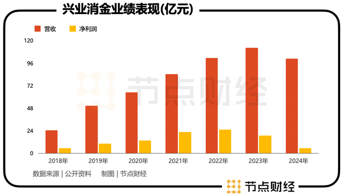 2014年底,兴业消金正式诞生,之后几年,乘着互金政策的“旋风”,不断壮大和强盛。2020年、2021年,兴业消金营收分别为64.7亿元、84.1亿元,净利润分别为13.5亿元、22.3亿元。