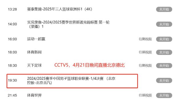4月21日CBA季后赛8进4赛程!京城德比央视调整,CCTV5节目单!