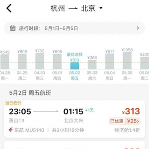 5月2日,杭州飞北京经济舱机票价格最低为313元(不含税),相当于打了1.4折。