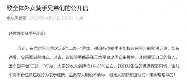 4月21日,京东发布《致全体外卖骑手兄弟们的公开信》,公开信直指某平台“五宗罪”,一口气扯下了外卖行业的遮羞布。