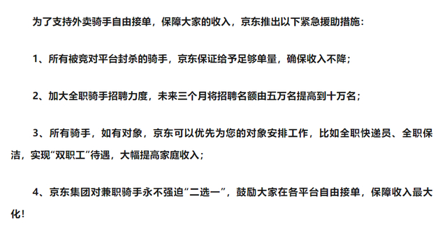 在指出某平台的五宗罪后,京东又祭出了杀招。在《公开信》中,京东列出了四项措施。大概的意思是被竞争对手封杀的骑手,京东给足单量,不让他们的收入下滑。而且所有骑手的对象,京东优先安排工作。京东还不搞二选一,骑手也可以去其它平台接单。最后,告诉骑手们,快来吧,我还要招10万名全职骑手。
