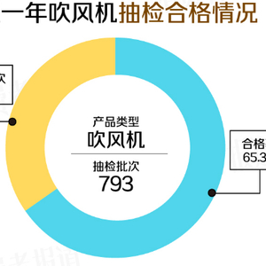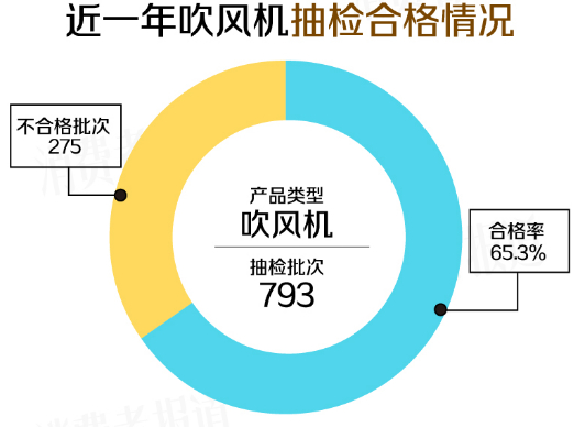 据《消费者报道》统计,近一年,国家市场监督管理总局及各省市级市场监督管理局共发布793批次吹风机抽检数据,其中275批次不合格,整体合格率约为65%。