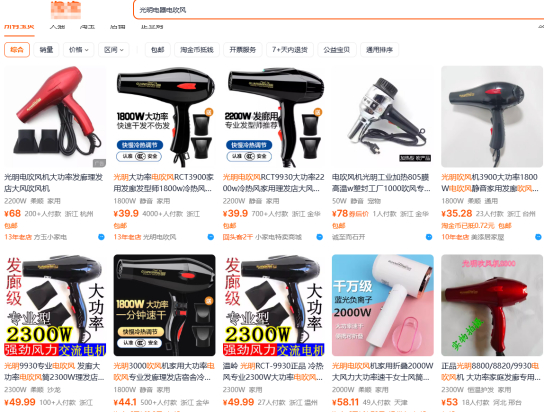 《消费者报道》记者发现,在电商平台上,光明电器的吹风机销量不低,价格较为亲民,如39.9元、68.0元、49.9元,商家宣称的关键词涉及“大功率”“大风力”“发廊级”“专业型”“千万级”“专业吹风机”等。