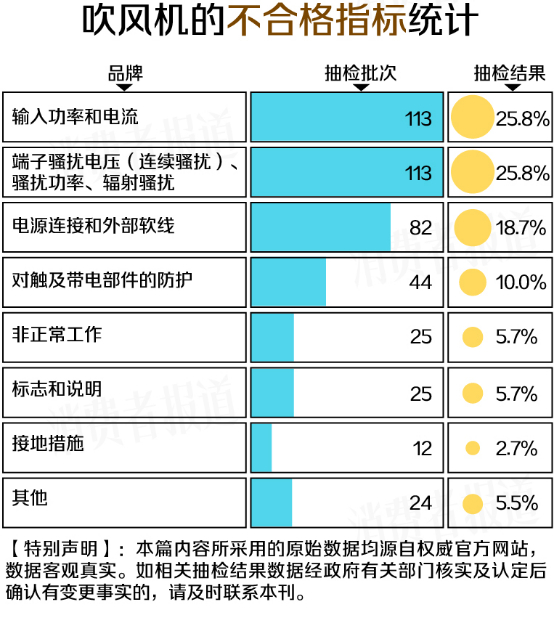 输入功率和电流,113批次不合格,占比25.8%。输入功率是反映家用电器产品实际输入功率和额定输入功率的偏差是否在标准规定范围内的指标。偏差过大可能会导致消费者选取到不配套的电源、插座,使用会造成过载现象,从而引发触电、火灾等危险。