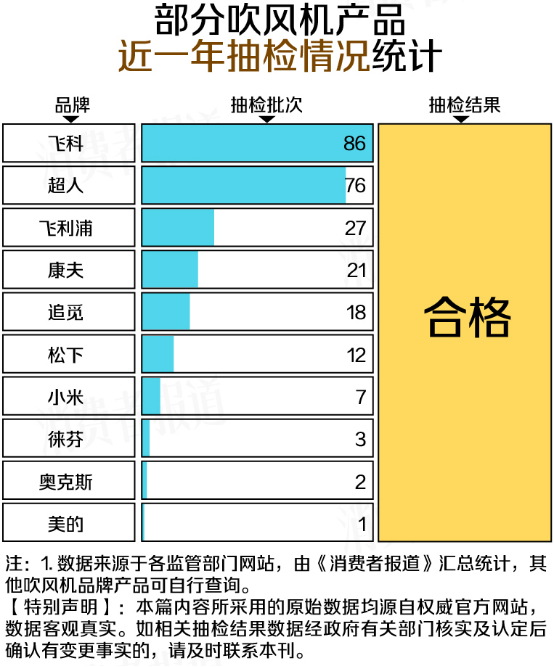 近800批次吹风机数据:飞科、超人被抽检约80批次,均合格
