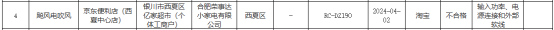 2024年11月,宁夏回族自治区市场监督管理厅发布《自治区市场监管厅关于2024年度电商领域销售产品质量专项监督抽查结果的通告》。该通告显示,1批次标称由“合肥荣事达小家电有限公司”生产的飚风电吹风(RC-DZ190)被检出不合格,不合格项目为输入功率、电源连接和外部软线。