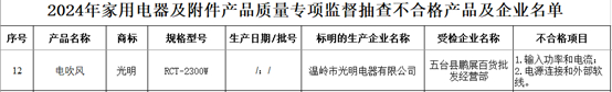 其中,2025年1月,山西省市场监督管理局发布《山西省市场监督管理局关于电子及信息技术产品、家用电器及附件产品质量专项监督抽查结果的通报》。该通报显示,1批次标称由“温岭市光明电器有限公司”生产的商标为“光明”的电吹风被检出不合格,规格型号为RCT-2300W,受检企业名称为五台县鹏展百货批发经营部,不合格项目为输入功率和电流、电源连接和外部软线。