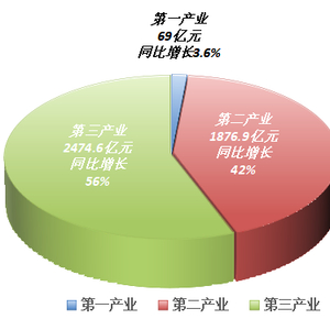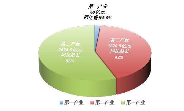 分产业看,第一产业增加值69.0亿元,增长3.6%;第二产业增加值1876.9亿元,增长5.9%,其中工业1757.2亿元,增长6.8%;第三产业增加值2474.6亿元,增长5.3%。三次产业之比为1.6∶42.4∶56.0。三次产业对GDP增长的贡献率分别为1.2%、46.7%和52.1%。