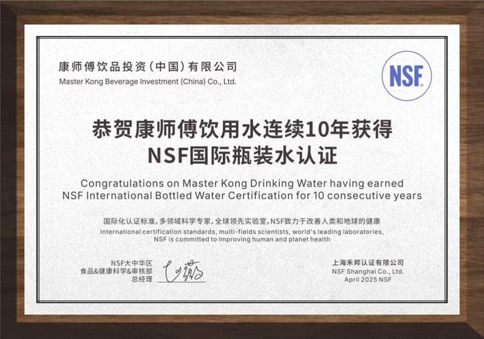 而得益于国家专利和更高品质,康师傅已经连续10年荣获NSF国际认证。据了解,NSF是世界卫生组织(WHO)在食品安全与饮用水安全与处理方面的指定合作中心,其认证标准被公认为全球食品饮料行业的“黄金准则”。康师傅作为国内极少数通过此项严苛认证的饮品企业,NSF国际认证不仅是对其产品质量的权威背书,更将“安心之选”这一品牌承诺通过国际标准具象化。每一瓶带有NSF国际认证的康师傅饮用纯净水,都是对消费者“喝得放心”这一核心诉求的有力保障。