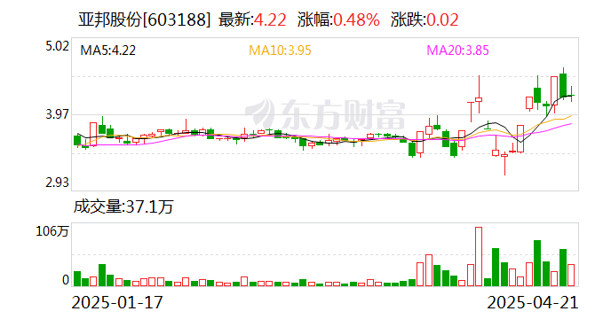 证券时报·数据宝统计显示,亚邦股份今日收盘价为4.22元,上涨0.48%,日换手率为6.50%,成交额为1.56亿元,全天主力资金净流入143.21万元,近5日该股累计上涨0.24%,近5日资金合计净流入3131.15万元。