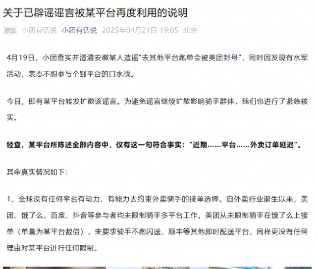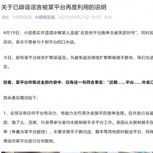 4月21日晚间,美团官方微信公众号小团有话说发文称,4月19日,小团查实并澄清安徽某人造谣“去其他平台跑单会被美团封号”,同时因发现有水军活动,表态不想参与个别平台的口水战。“为避免谣言继续扩散影响骑手群体,我们也进行了紧急核实。”
