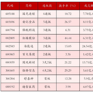 截至4月21日收盘,上证综指上涨0.45%,收于3291.43点,深证成指上涨1.27%,收于9905.53点,创业板指上涨1.59%,收于1944.32点。今日沪深两市A股共计114只涨停,综合当前连板数以及当日龙虎榜数据,其中较为强势的前三只个股分别为:国光连锁(605188)、安记食品(603696)与保税科技(600794)。今日强势个股前10位具体数据见下表: