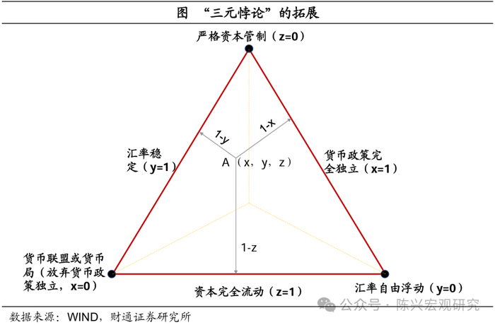 汇率阶段性影响货币政策节奏。从根本来说,国内利率水平与货币政策操作密切相关,是对国内经济基本面变化的反映,而汇率仅仅是阶段性影响货币政策节奏,但不至于扭转市场利率的走势。在三元悖论的约束下,一国无法同时保持资本自由流动、独立货币政策和固定汇率制度。基于此,我国实施“货币政策独立+有限制的资本流动+有管理的浮动汇率制”的政策组合,并多次强调“稳汇率”与“宽货币”的内外均衡,也就是下图中X、Y、Z 的变动范围都位于0至1区间,X+Y+Z=2的解可以不落在三角形边上,而在三角形内部。