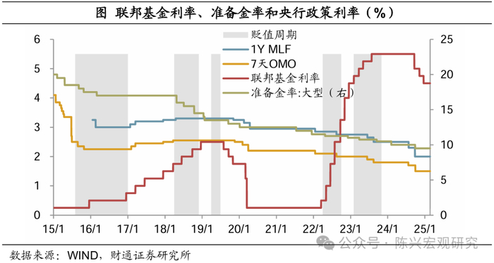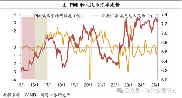 国内基本面才是降息决定性因素。在第一轮2015年8月至2016年底的贬值周期内,央行2015年8月和10月均采取了降准和降息操作,而2016年全年并未降息,对比来看,一方面,2016年汇率压力加大,美联储加息预期不断升温,导致美元指数持续走强,年末美元兑人民币即期汇率升至6.95,2015年末仅为6.5,人民币全年贬值幅度达7%;另一方面,更重要的是2016年经济形势相对稳定,通缩压力有所缓解,PMI此前荣枯线下持续下探的态势也被逆转,逐步回升至线上,货币政策转向稳健中性。