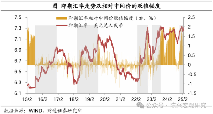 央行或仍在维持7.3的汇率底线。央行对人民币汇率的管理基于“合理均衡水平上的基本稳定”,而在中美经济周期、货币政策分化和贸易摩擦等的影响下,汇率的波动范围持续变化,央行对于人民币汇率的合意区间也在同步改变。回顾历次央行出手干预时的汇率水平,2015年至2018年间,央行在汇率近6.9时推出稳汇率政策;2019年至2022年间,汇率曾在2019年三季度接近7.2,但央行并未出台稳汇率政策,而在2022年三季度汇率突破7.2后,央行频繁推出稳汇率政策;2023年以来,央行或意在控制汇率在7.3以下波动,如2023年7月调升跨境融资宏观审慎调节参数,随后9月调降外汇存款准备金率,2025年1月上半月,央行采取了一系列稳汇率措施,包括暂停常规国债购买操作、发行离岸人民币央票以及再度上调跨境融资宏观审慎调节参数,均发生在汇率单边行情且一度越过7.3的背景之下。