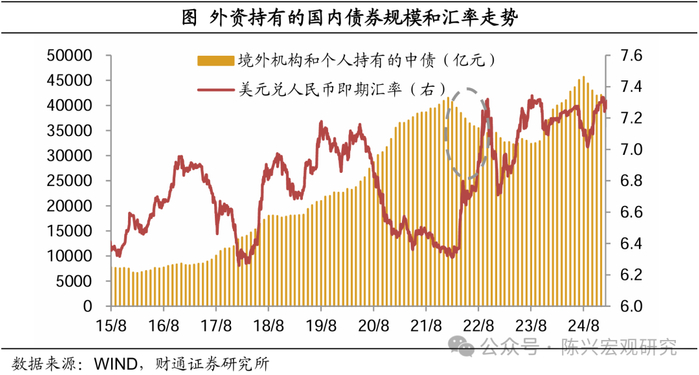 同向变动均受短期事件扰动。通常汇率贬值会伴随着利率下降以吸引资金流入,但是当汇率和利率所反映的经济预期分化时,或者中美关系出现较大变化时,二者会短暂地呈现正向关系。一方面,在经济增长承压时,国内基本面对于宽松的诉求较强,但人民币贬值使得货币政策的操作空间受限;另一方面,汇率的影响因素较多,美元指数、中美利差、短期套利和国际收支等都会使得汇率产生波动,短期汇率或出现超调的情况,从而引起外资减持人民币债券。