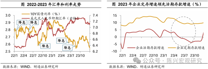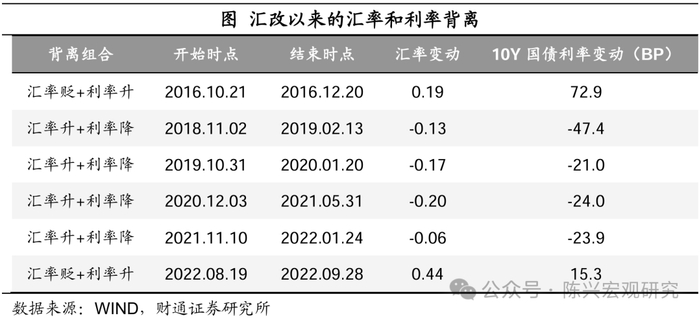 汇率和利率短期可能同向变动。不过,汇率贬值和利率下行并不一定同时出现,短周期内汇率和利率呈正向关系的情况也曾出现过。2016年10月末至12月末和2022年8月至9月,人民币汇率趋于贬值,10年期国债到期收益率同步上行;此外,2018年末至2022年初中间断断续续有四个时段,人民币汇率升值与长债利率下行同时出现。这些时段持续时间大多都在一个季度以内,汇率和利率很快仍将回归反向变动。