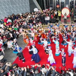 3月16日,在贵州省贵阳市越界影城举行的民族文化表演活动吸引游客观看。徐其飞 摄