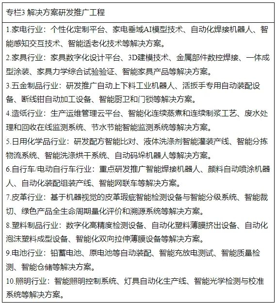 5.壮大服务队伍。依托智能制造系统解决方案揭榜挂帅、供应商能力评估等工作机制,遴选发布一批优质数字化转型供应商。面向家电、家具、五金等离散型轻工业研发推广智能排产、自动化装配组装、智能仓储等解决方案。面向造纸、日用化学品等流程型轻工业研发推广智能配方设计、质量在线监测、设备预防性维护等解决方案。面向中小企业研发推广一批“小快轻准”的解决方案。