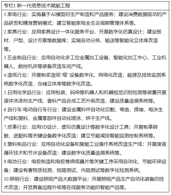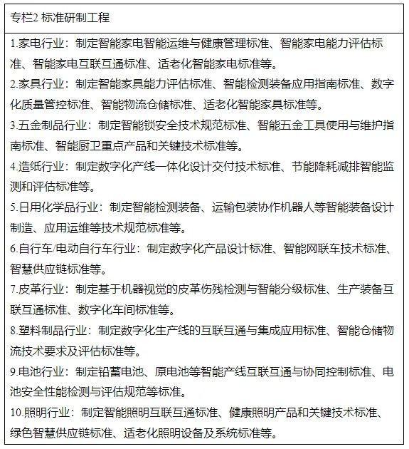1.推动高端化跃升。深化物联感知、智能控制、人机交互等技术在家电、家具、照明、手表等终端消费品的应用,推动智能产品跨品牌互联互通。围绕老人、儿童等重点人群,研究开发适老化智能家居、生活服务类机器人等智能产品。鼓励家电、家具、皮革、五金制品等数字化基础好的产业园区,加快5G、工业互联网、数据中心等新型基础设施布局和规模化应用,推动园区内配套企业间数据可信共享,打造高水平数字化园区。