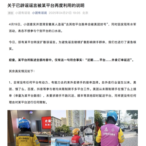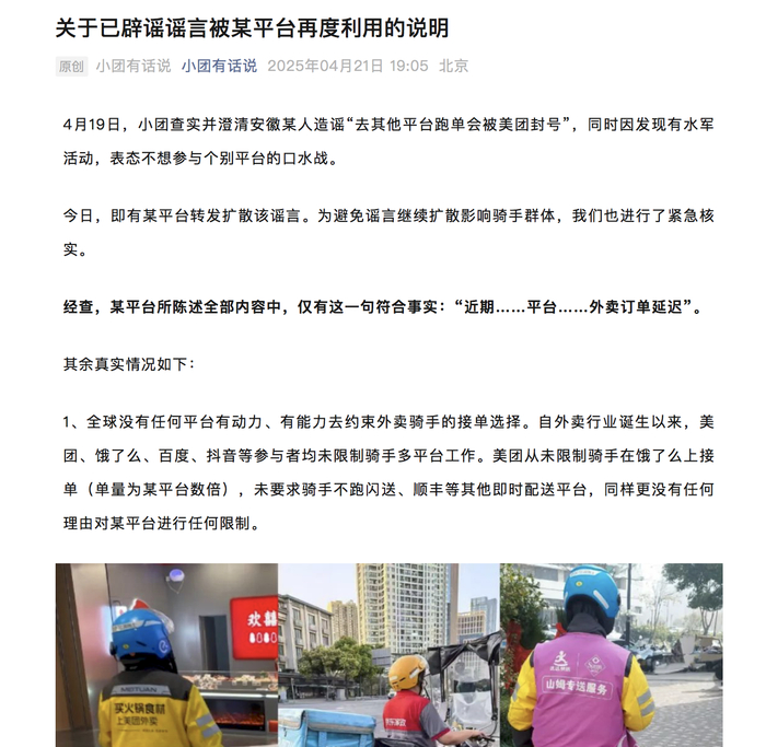 4月19日,小团查实并澄清安徽某人造谣“去其他平台跑单会被美团封号”,同时因发现有水军活动,表态不想参与个别平台的口水战。
