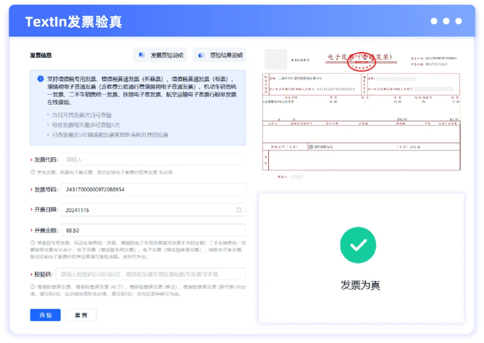 企业可通过调用TextIn国内通用票据识别与发票验真,系统自动判断发票类型,采集关键要素信息,输出真伪查询结果,实现发票智能分类、识别、验真全流程自动化。