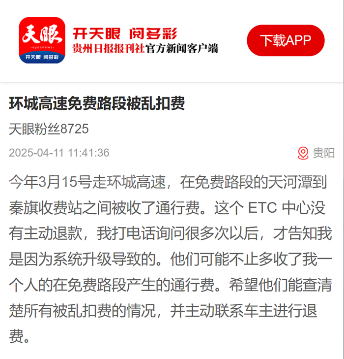 近日,贵阳市民邬先生向贵州日报天眼新闻“天眼问政”栏目反映,他驾车行驶环城高速时,在免费路段被收了通行费。当时ETC中心没有主动退款,而是在他多次致电反映后才有结果。