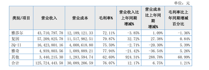 从营收构成来看,雅莎股份主要收入来源于旗下的四个护肤品牌:雅莎尔、复因、ZQ-II、雅奇。其中,雅莎尔和复因两大核心品牌贡献了绝大部分的营收来源。