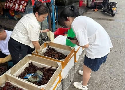“小龙虾便宜卖了,3钱的20元/公斤,五六钱的34元/公斤,称点回家尝尝吗?”名为“龙虾批发”的摊位前,摊主唐女士正热情地招揽着来往的顾客。她一边掀开盖布展示活蹦乱跳的小龙虾,一边介绍:“今天的小龙虾价格是最近一段时间内最便宜的,3钱大小的比上周末便宜8元每公斤,五六钱的每公斤便宜了10余元。虽然降价了,品质还是很不错的,很有性价比。”
