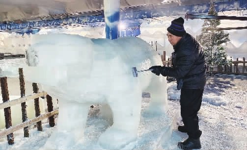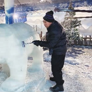 徐明给还需细致雕刻的北极熊冰雕装上LED眼睛,冰雕在彩灯映照下泛起幽蓝光泽,冰雪馆里孩童们的惊叹声穿透玻璃幕墙。当了20年冰雕师的徐明搓着手,嘴角随着孩子们欣喜的呼喊声上扬,“都说咱们冰雕师是‘冷职业’,你看这冰雕,越冷越发光”。