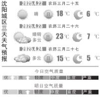 预计周三(23日)是冷空气间歇期,充足的阳光使沈城最高气温攀升至23℃左右,最低气温7℃上下,这也可能是本周最温暖的一天,非常适合大家到室外活动。目前来看,随着冷空气的到来,周四(24日)、周五(25日)沈城又将迎来新一轮降温,这次冷空气停留时间较长,建议大家要根据气温情况,及时调整着装。