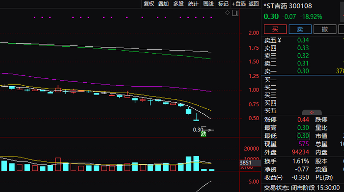 4月21日,*ST吉药(300108.SZ)股价再度跌停,报0.30元,这是该股连续第18个交易日股票收盘价低于1元,据记者测算,即便后续两个交易日收盘涨停,该股股价也回不到1元以上,将触及面值退市规定。