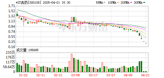 4月21日,*ST吉药(300108.SZ)股价再度跌停,连续第18个交易日股票收盘价低于1元,或已提前锁定面值退市。