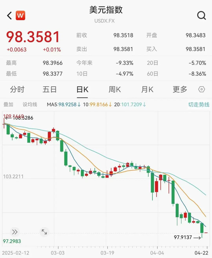 今年以来,美元指数持续下行,4月21日刷新近三年低点,盘中跌破98,《纽约时报》近期分析称,美元持续下跌,可能表明投资者开始避开长期以来是全球金融市场“避风港”的美元。