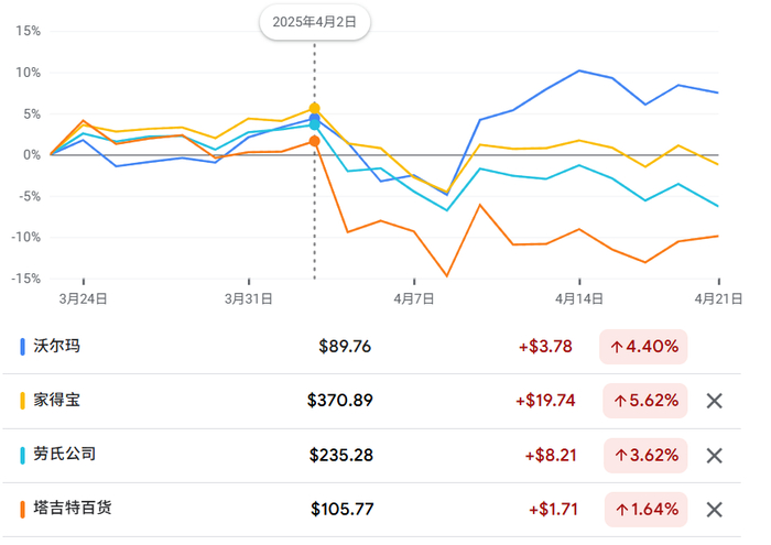 自所谓对等关税宣布以来,除沃尔玛外,零售巨头股价均呈现不同程度下跌。