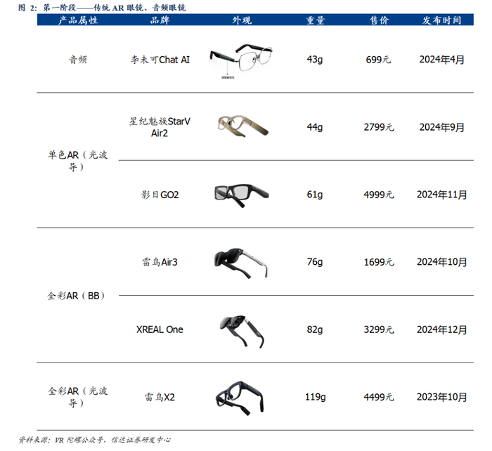 ①传统AR眼镜:2024年前的主流产品形态,分体式承接观影功能,一体式搭载AI。分体式(显示单元和计算单元分离)应用场景局限于投屏/观影(如雷鸟Air3、XREAL One),一体式(显示系统、计算单元、传感器和电池等核心组件高度集成在眼镜框架内)存在功能简单、硬件水平不足、价格昂贵等问题,如2023年10月发布的雷鸟X2重量达119g、售价达4499元;2024年发布的星纪魅族StarVAir2、影目GO2均为单绿色显示,主要功能仍集中于翻译等,基本不具备AI交互能力。