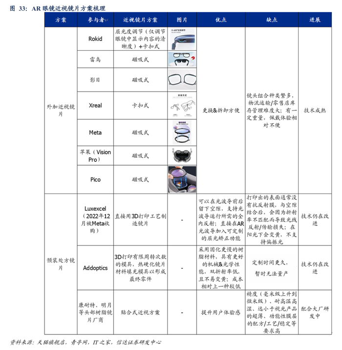 近视镜片为AR眼镜落地核心环节,当前磁吸/插入式为市场主流,贴合式、融合式技术稳步突破。磁吸/插入式近视镜片具备更换/拆卸便捷的优点,适合早期产品快速落地,但仍存在厚重、佩戴体验感不佳等缺点。当前康耐特、明月等头部厂商积极配合大厂研发三合一贴合式方案(保护片+光波导+度数片),保护片&度数片均使用树脂材料,ASP由2片增加至4片、单片ASP亦有望明显提升,同时高技术壁垒有望驱动份额显著提升。此外,光波导融合度数的新材料方案也处于实验室研发阶段,不同参与者持续研发迭代,行业有望迎来新突破。