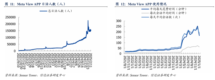 Rayban Meta爆品验证垂类发展趋势。Rayban Meta从功能需求本质出发,简化设计、抓住垂直细分领域切入(如直播),在Rayban Stories基础上硬件大幅升级,软件端接入AI大模型,新增多种交互功能(如摄像头翻译、物体识别等)。根据Sensor Tower数据,Meta View APP(用于管理和控制Meta智能眼镜的APP)日活人数、每天平均使用时长、每天平均使用会话次数、每次会话平均停留时长均稳步提升,24年12月在大促推动下达到巅峰,验证Rayban Meta的拍摄和AI互动功能的确是被高频使用的。