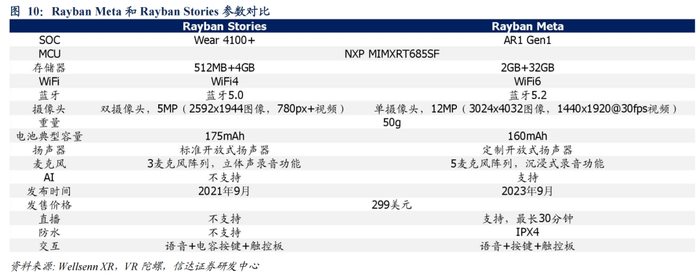 RayBan Meta引领AI+拍摄眼镜发展,AI大模型优化+拍摄效果改进促成爆品。RayBan Stories是RayBan与Meta合作的首款智能眼镜(2021年9月发布),搭载高通Wear 4100+SoC、512MB+4GB内存、双五百万摄像头、三麦克风,支持WiFi蓝牙连接、音频录入播放、图像视频拍摄等功能。RayBan Meta于2023年9月推出,升级为骁龙AR1 Gen1、2GB+32GB内存、1200万像素摄像头、五麦克风,WiFi蓝牙芯片升级(连接速度更快、功耗管理更强),新增直播、AI相关功能。