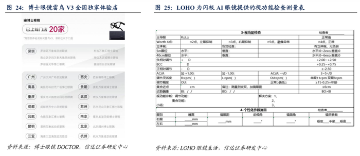 区别于3C产品,眼镜店是眼镜产品交付的“最后一公里”。目前眼镜消费仍依赖于线下验光,此为眼镜门店的基础功能;由于眼镜具有一定的医疗属性,多数消费者认知不充分,在选购镜片时依赖于线下验光师讲解推荐。此外,眼镜店可提供丰富的镜架选择供消费者现场试戴,且同店购买割边、装配更方便。眼镜店通常会配备一定镜片及镜架库存,适用于常规度数范围,立等可取,眼镜店或加工中心(眼镜店自建或合作)需承担一定的库存压力,如博士眼镜2023年光学眼镜镜架库存占其销量比例为51.4%,光学眼镜镜片库存占其销量比例为12.6%;部分优质眼镜店可提供定制化配镜服务,满足不同类型的用镜需求(如渐进多焦、抗疲劳、轻薄镜片等)。