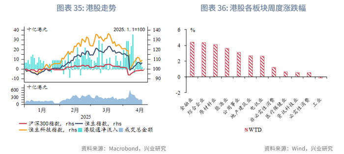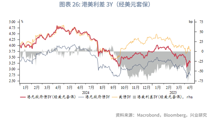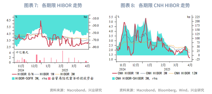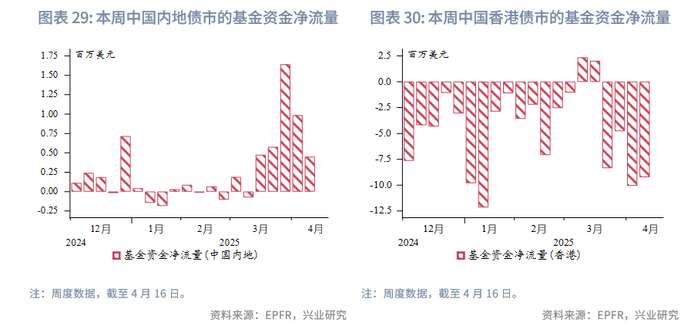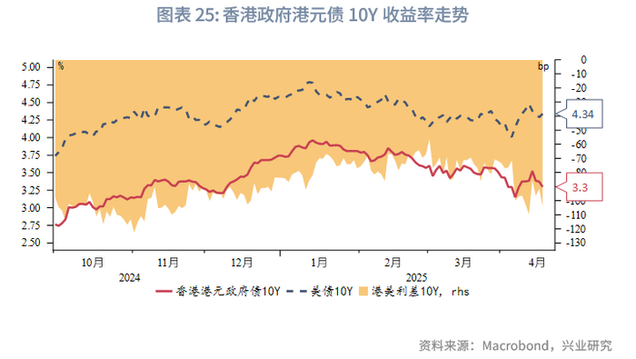 金融市场:货币市场方面,本周隔夜HIBOR上行19bp至3.3%。各期限港美资金利差小幅走阔。离岸人民币资金流动性大幅转松,1周期限CNH HIBOR大幅下行77bp,离岸与在岸人民币资金利差大幅收窄。外汇市场方面,本周澳元、新西兰元持续大幅反弹,关税风波短暂减弱后,澳元与新西兰元因避险情绪的修复而补升。本周港元相对美元略有走弱,但仍在强方兑换保证附近,香港金管局还未进行直接干预。因中间价缓慢上调,引导人民币有序释放贬值压力,离岸人民币与在岸人民币汇差收窄。债券市场方面,剔除香港金管局发行的外汇基金票据,本周港元债发行金额仅为7亿美元。财政部将于4月23日在香港发行2025年第二期人民币国债,发行规模为125亿人民币。离岸中国国债10Y收益率上行3bp。受美债影响,港元政府债10Y收益率下行9bp,小于美债的下行幅度。权益市场方面,本周恒生指数震荡上行,南向资金净流入幅度较前一周下降,净流入232亿港元,被动型外资净流出幅度大幅上升。往前看,美国政策不确定性仍然很高,港股受到美股波动性外溢影响程度仍处于历史高位。港股仍受南向资金支撑,短期或取决于中美贸易谈判进展和内地增量政策的出台。