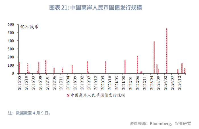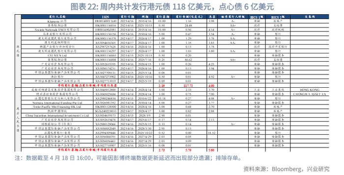 一级市场方面,本周港元债共计发行15只,发行金额换算为美元为118亿,剔除香港金管局发行的外汇基金票据,港元债发行金额仅为7亿美元。本周点心债共计发行14只,发行金额换算为美元为6亿。财政部将于4月23日在香港发行2025年第二期人民币国债,发行规模为125亿人民币。