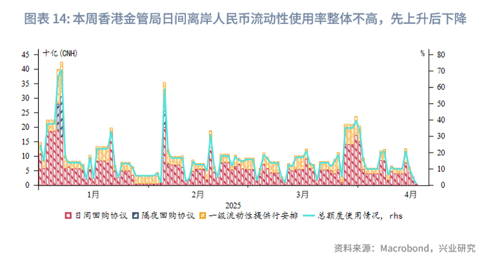 离岸人民币资金面:受美对等关税推迟、美元走弱等影响,本周离岸人民币资金流动性大幅转松,1周期限CNH HIBOR大幅下行77bp,引领曲线下移。离岸与在岸人民币资金利差大幅收窄,其中1周期限CNH HIBOR与SHIBOR之差收窄80bp。由于离岸人民币融资环境宽松,本周香港金管局日间离岸人民币流动性使用率整体不高,呈先上升后下降趋势。
