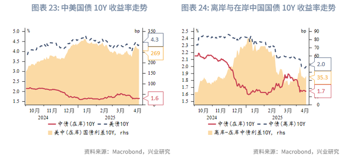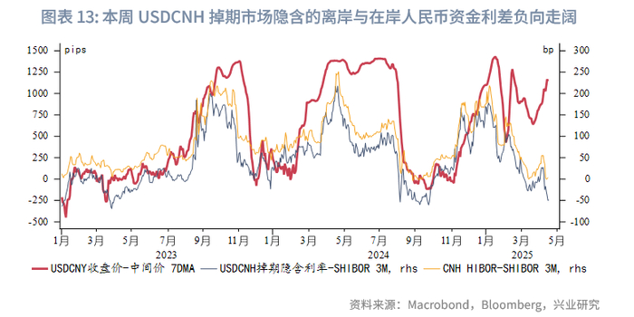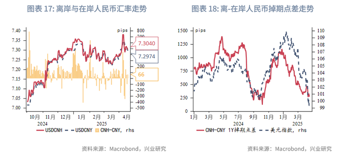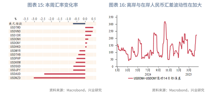本周美元指数继续下跌至99附近,但跌势有所放缓,亚太货币多数反弹。澳元、新西兰元持续大幅反弹,关税风波短暂减弱后,澳元与新西兰元因避险情绪的修复而补升。本周港元相对美元略有走弱,但仍在强方兑换保证附近,香港金管局还未进行直接外汇干预。因中间价缓慢上调,引导人民币有序释放贬值压力,离岸人民币与在岸人民币汇差收窄,但离岸与在岸人民币汇差波动性在加大。