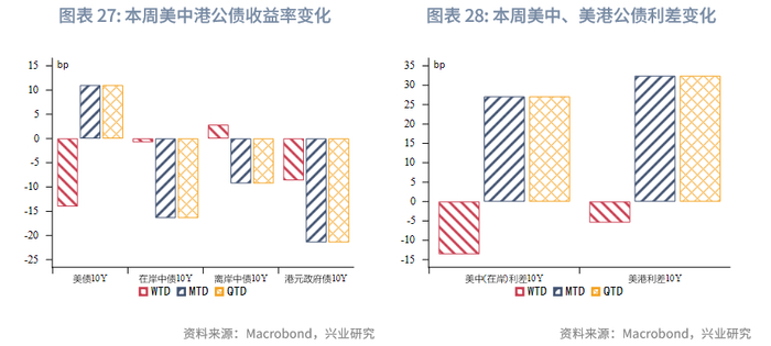 二级市场方面,在岸中国国债10Y收益率下行1bp,美中利差10Y收窄14bp至269bp。离岸中国国债10Y收益率上行3bp。受美债影响,港元政府债10Y收益率下行9bp,但小于美债的下行幅度。根据EPFR口径,本周投资中国内地债市的基金资金净流入幅度减小,投资香港债市的基金资金净流出幅度减弱。