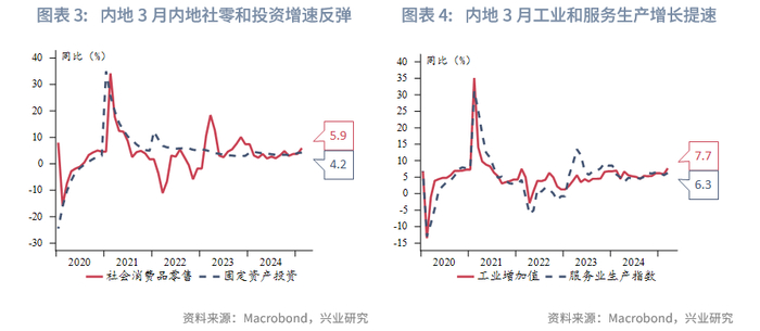 中国:2025年第一季度中国内地经济在美关税影响发酵前实现开门红,GDP同比增长5.4%,名义GDP同比增长4.6%,GDP平减指数连续8个季度收缩。投资方面,3月同比增长4.3%,较1-2月提升0.2个百分点,其中基建投资和制造业投资增速进一步提高分别至 12.6%和9.2%,房地产投资跌幅走阔。消费方面,3月社会消费品零售总额同比增长5.9%,较1-2月提升1.9个百分点,刷新2024年以来新高,以旧换新持续发力。生产方面,3月工业增加值同比增长7.7%,较上月提高1.8 个百分点,或因抢出口效应;3月服务业生产指数同比增长6.3%,较上月提高 0.7个百分点,消费品以旧换新提振批发零售等服务业。4月18日,国务院常务会议研究稳就业稳经济推动高质量发展的若干举措,特别提及要持续稳定股市。