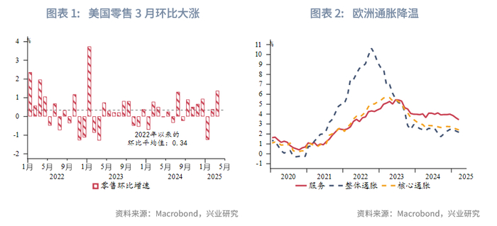 欧美:特朗普威胁征收新关税。在美国宣布给予智能手机、电脑等产品关税豁免后不久,特朗普再次强调将对半导体和药品征收行业关税。美联储主席鲍威尔在周三的讲话重申美联储不急于调整货币政策。鲍威尔重申特朗普的关税政策大幅超出预期,由于经济增速可能放缓,通胀大概率升温,失业和通胀在今年剩下的时间内可能偏离政策目标,并强调“没有价格稳定,我们就无法创造令全体美国人受益的长期强劲的劳动力市场条件”。他的表态暗示美联储将耐心等待形势和经济政策进一步明朗,观察通胀然后再考虑是否调整政策立场。特朗普对鲍威尔公开施压,促联储降息,市场担忧政治因素影响联储货币政策的独立性。美国3月零售环比大涨1.4%,符合预期,显著高于2022年以来的环比平均增速。受关税影响,美国消费者大量采购价格可能上涨的商品,特别是汽车和建筑材料。餐饮消费也有所回升。欧央行4月议息会议降息25bp至2.2%,尽管删除货币政策“限制性”修饰词,但指出经济下行风险抬升;明确服务业去通胀取得进展,但贸易局势带来不确定性。兴业研究外汇商品部预计欧央行将继续依赖关税争端演变以及经济数据做决策。