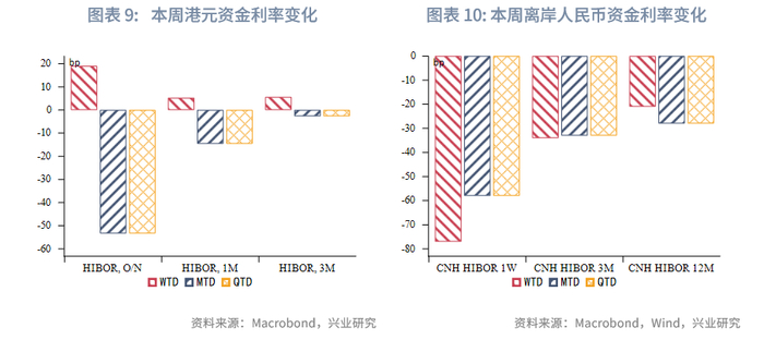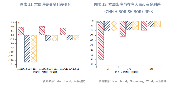 港元资金面:本周各期限HIBOR上行,其中隔夜HIBOR上行19bp至3.3%。各期限港美资金利差小幅走阔,主要因港元资产需求增加。